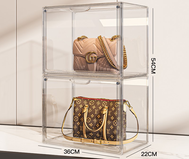 - Chất Liệu Hộp Đựng Túi Xách: 100% nhựa cứng trong suốt giúp bạn nhiều thấy chúng mọi góc nhà.