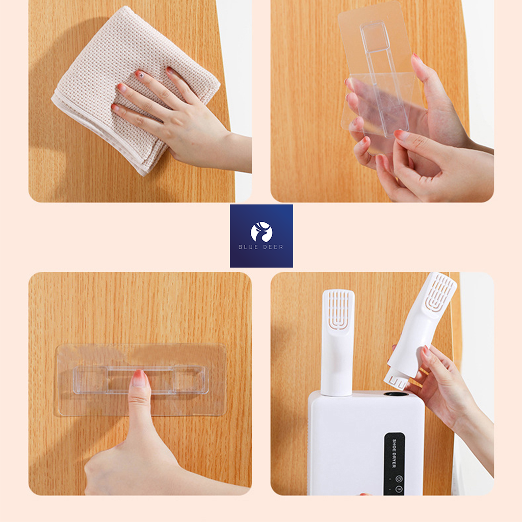 - Để Miếng Dán vào chỗ đặt miếng dán của Máy Sấy Giày Khử Mùi, xong lau sạch tường mịn láng… Lọt lớp bảo vệ keo ấn máy vào tường.